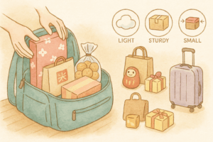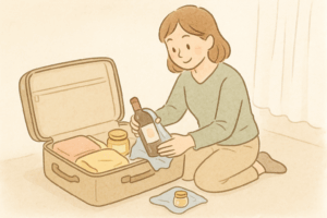 お土産を守るには、衣類で包む・プチプチを利用するなど工夫が必要です。ガラス製品や瓶入り食品は特に丁寧に扱いましょう。