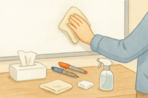 最後の「ホワイトボードマーカーで上書き」は、油性ペンで書いてしまった場合の緊急対策です。ホワイトボードマーカーの剥離剤が油性インクを溶かし、一緒に消してくれる現象を利用したものですが、ボードに負担がかかるため、あくまで最終手段と考えてください。日頃から水拭きやアルコールでの定期的なメンテナンスを心がけ、代用品は慎重に利用しましょう。