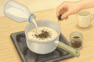 - 牛乳を温めてから茶葉を投入: 冷たい牛乳から煮出すよりも、温めた牛乳に茶葉を投入することで、抽出温度をすぐに維持でき、効率よく濃い成分を引き出せます。