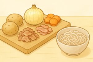 ホクホク系の男爵いもは味をよく吸い込みますが崩れやすいので、形を保ちたい場合はメークインが最適です。新じゃがを使うと皮ごとでも柔らかく仕上がり、より自然な甘みが出ます。玉ねぎは甘みを出すポイントで、じっくり炒めるとコクが増し、全体の味に深みを与えます。肉は牛肉が定番ですが、豚肉を使うとやさしい風味に仕上がり、鶏肉を使うとあっさりとした軽い味わいになります。