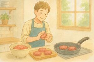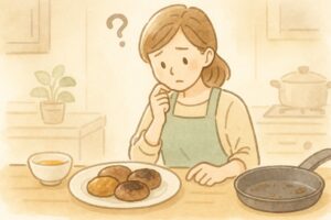 | 生焼け | 火力が強すぎて表面だけ焦げた/成形時に中央をへこませていない | 弱火で蓋をして蒸し焼きにする/電子レンジで少しだけ加熱する |