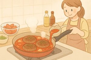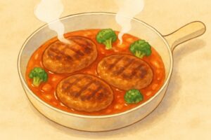 煮込みハンバーグの柔らかさを決定づけるのは、火加減と煮込み時間です。まずはハンバーグをフライパンで両面焼き、しっかりと焼き色を付けてから煮込みソースを加えます。沸騰したらすぐに火を弱火にし、約15~20分ほど蓋をしてじっくりと煮込みましょう。これにより、ソースの水分がハンバーグ内部にゆっくりと浸透し、しっとりとした食感になります。