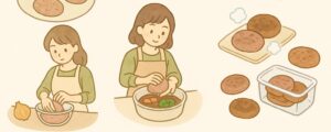 特に煮込みハンバーグは、ソースの水分のおかげで冷凍してもパサつきにくいので、作り置きに最適ですよ。