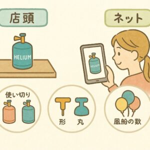 また、店頭で実物を見て容量やサイズ感を確認できるため、初めてヘリウム缶を購入する方でも選びやすいというメリットがあります。ただし、在庫は店舗によって差があるため、確実に購入したいときは来店前に在庫確認をしておくと安心です。