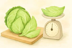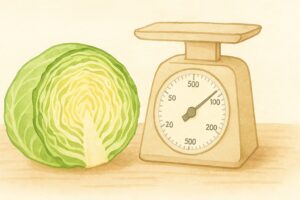 ただし、キャベツの大きさは外葉・内葉の違いによって前後するため、「必ずこの重さ」と決めつけず、“だいたいこのくらい”と幅を持って考えるのが安心です。