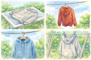 干す前に形を整え、途中で一度様子を見るだけでも、仕上がりは大きく変わります。特にパーカーは生地が厚く、乾くまでに時間がかかりやすいため、干している途中の状態がそのまま仕上がりに影響しやすい衣類です。