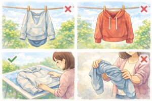 こうした積み重ねが、結果的に伸び・劣化の原因になります。どれも少し意識するだけで防げる失敗なので、干す前に一度思い出して避けるようにしましょう。