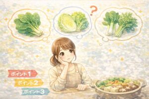 迷ったときは、次の3点を意識してみてください。白菜の代わり野菜を選ぶ際に、このポイントを押さえておくことで、鍋の仕上がりに大きな差が出にくくなります。