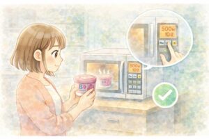 加熱時間は、カップ1個に対してまずは5秒〜10秒からスタートするのが目安です。一度取り出して様子を見て、まだ固ければ3秒ずつ追加するようにすると失敗しにくくなります。