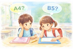 まずは多くの学校で使われているB5から始めてみて、実際に授業や宿題で使う中で「プリントが多くて足りないな」「もう少し大きいほうが書きやすそう」と感じたタイミングで、A4サイズを買い足せば大丈夫です。