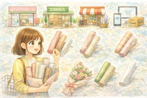 花束用のラッピングペーパーは、予算やこだわりの度合いによって選ぶ場所が変わります。まずは、どこに行けば手に入るのか全体像を把握しましょう。「安く手軽に」なら100均、「質にこだわる」なら専門店というように、用途に合わせて使い分けるのがポイントです。