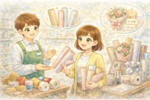 特別な日の贈り物や、仕上がりの美しさにこだわりたい時は、専門店に足を運んでみましょう。100均とは一線を画す「質感」や「発色の良さ」が、花束の価値をさらに高めてくれます。実際に目で見て触れることで、お花との相性をより深く確認できるのが最大のメリットです。