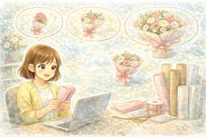 通販で理想のペーパーにたどり着くには、検索ワードの工夫が大切です。「花束 ラッピング」だけでなく、「不織布 ロール」「クラフト紙 厚手」「防水 ラッピングシート」など、具体的な素材名を加えるのがコツ。