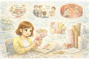 贈るシーンに合わせて色や柄を選ぶと、より気持ちが伝わります。お誕生日なら、お相手の好きな色や、明るく元気なビタミンカラーを。送別会なら、上品な落ち着いた色味や、感謝を伝える優しいパステルカラーが好まれます。発表会や舞台での贈り物は、ステージでも映えるよう少し華やかなゴールドやシルバーのアクセントが入ったものも素敵です。