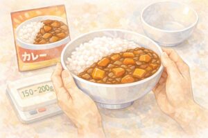 ルー多め派はご飯をやや控えめに、ご飯多め派は標準量より少し増やすと満足感が出ます。たとえばルーをたっぷり楽しみたい場合は、ご飯を20〜30gほど減らすだけでも全体のバランスが整いやすくなります。反対に、ご飯の食べごたえを重視したい場合は、まずは10〜20g程度から少しずつ増やして様子を見ると安心です。